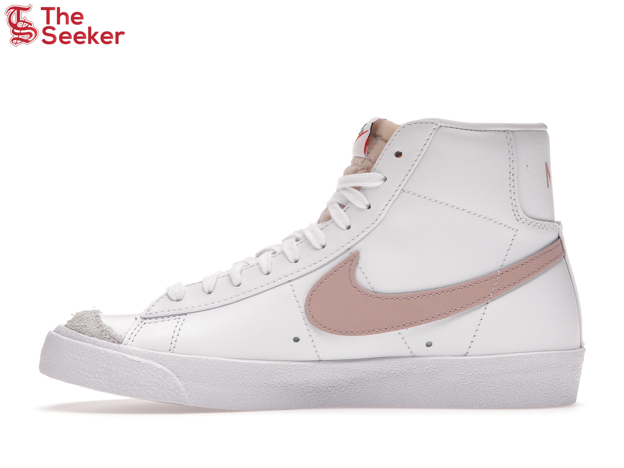 The Nike Blazer Mid 77 Vintage Summit White Pink (W) sneaker made for women features a white leather upper with hits of rough white suede on the toe and quarter.